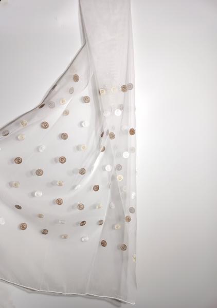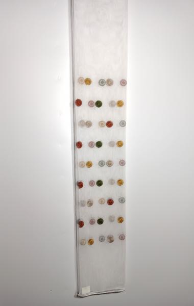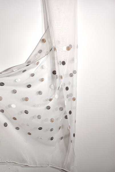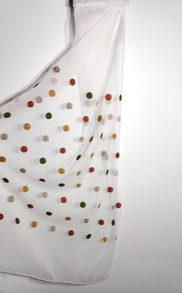 Záclona s vyšitými barevnými kolečky na jemné síťovině, transparentní, s olůvkem. Kolečka jsou našitá v pruhu 62cm širokém , 19cm nad spodním olůvkem.